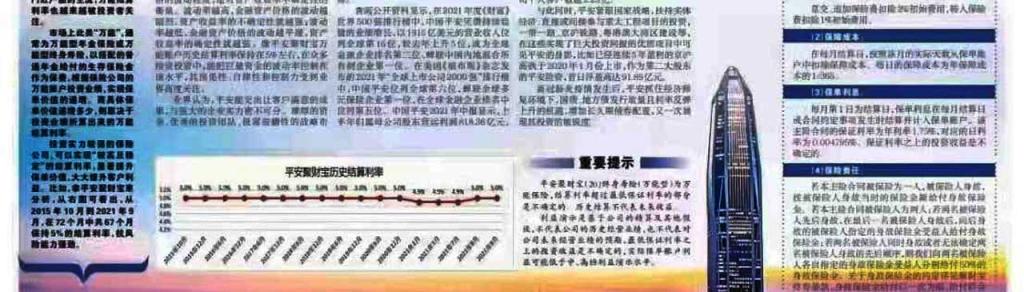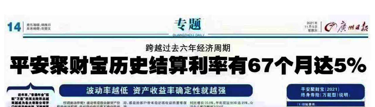 平安公司,从2015年10月以来,连续67个月时间结算利率一直稳健在5%de收益,2020年来受疫情影响,各保险公司的万能账户年化收益都有所波动,在国际国内疫情影响下的大经济环境聚财宝收益也不得不向下波动,虽然今年波动低到4.7%,我们也可以自豪的说,从2015年10月份开始到2022年10月,一共七年时间一共84个月,整整七年时间整整84个月的时间,我们的聚财宝万能账户收益一直维持在5%左右的结算利率,这样的高位运行,为平安所有的聚财宝客户画出了一条漂亮的平行线,这样的公司应该值得信任!