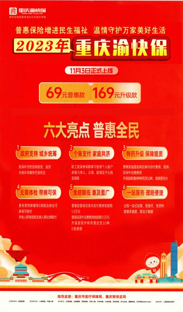 “重庆渝快保”是由重庆市医疗保障局和重庆银保监局指导监督,围绕多层次医疗保障体系建设,契合重庆“大城市大农村”二元结构城乡居民医疗保障需求,紧密衔接重庆市基本医疗保险的一款普惠型补充商业医疗保险。其普惠性体现在“低保费、低门槛、低免赔”、“医保个账支付”和“一站式结算”等政策支持,其公平性和可持续性体现在,69元和169元两档价格,通过科学界定既往病群体和健康群体,设置不同的赔付比例和有限的保障责任范围,统筹城乡,使更多患重病参保人在基本医保外的高额医疗费用负担,在一定程度上得到降低,继而起到防范因病致贫返贫、促进共同富裕的作用。“重庆渝快保”全年赔付率被要求不低于80%,具备较强的政策性和惠民性。