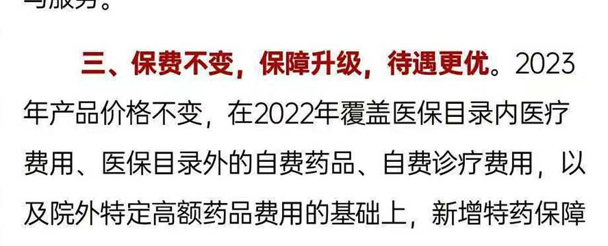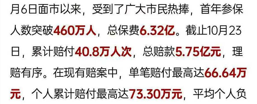 特别提示:同样不报销医保目录外医用耗材,不报销肿瘤靶向药费用肿瘤免疫之类药物费用、肿瘤细胞之类费用、罕见病特效药品费用,不报销医保超限额部分、医保限制用药,不报销指定的如供体处置费、要素因素、质子重离子治疗、X刀治疗等13种特定医疗费用。