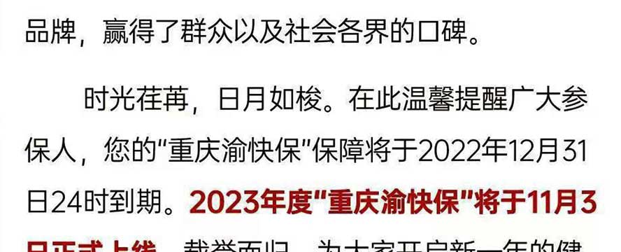 您购买的上一年“重庆渝快保“保障将于2022年12月31日24时到期。