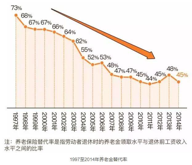 上面这张图是从1997年一直到2014年,所谓养老保险的替代率的变化数值,什么叫养老保险的替代率,说俗一点,就是我退休之前,一个月拿多少钱,退休之后能拿到养老金相当于我退休之前拿的那个钱的百分之多少,这就叫替代率。