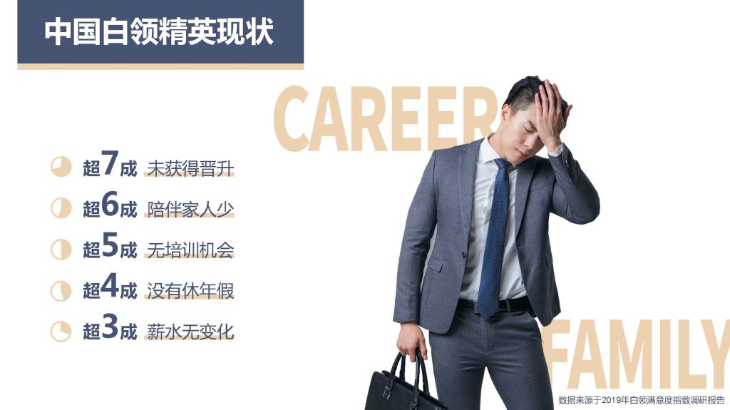 根据 2019 年白领满意度指数调研报告,当前中国的白领的核心关键词是焦虑, 超 3 成人收入没有增长,超 4 成人休假无法保证,超一半人没有培训提升的机会,超 6 成人没有时间陪伴家人,近 7 成人无法获得晋升,不过像您这样的优秀精英,应该发展的很好吧?