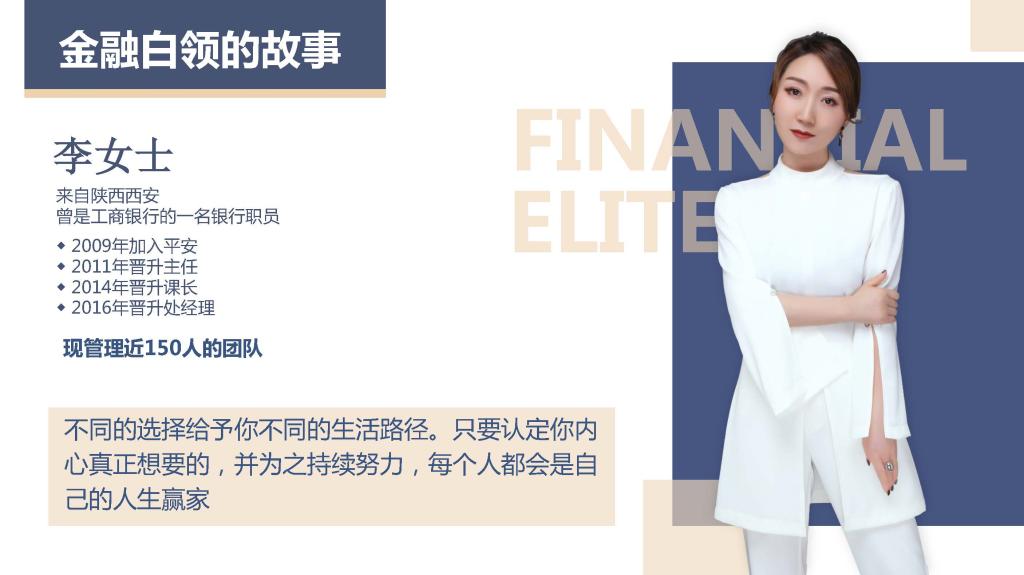 她曾是工商银行的一名银行职员,因为想要寻求更好的突破,毅然辞去金融白领的工作,选择加入了平安人寿,现在管理着百人团队。