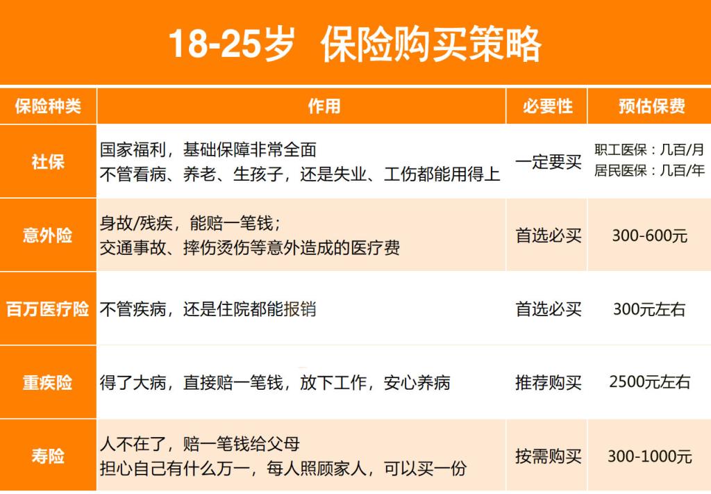 因此,在不同的人生阶段,我们要保障的风险并不一样,要买的保险也不一样。