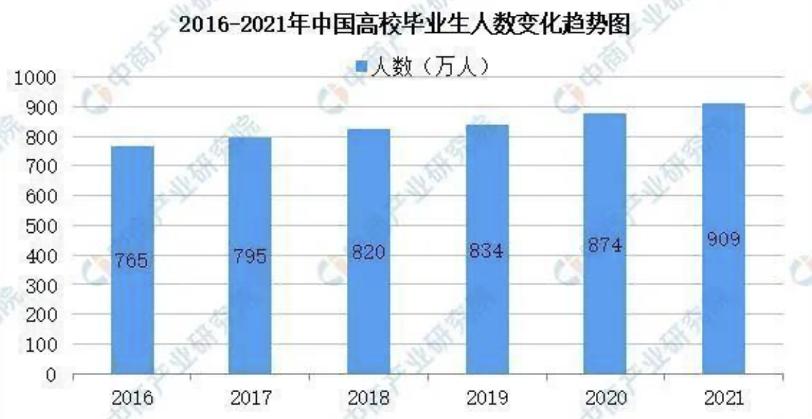 教育部公布今年高校毕业生人数——2021届全国普通高校毕业生总规模909万,同比增加35万。预计2022年毕业生总规模将达到1000万。