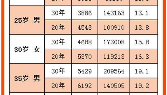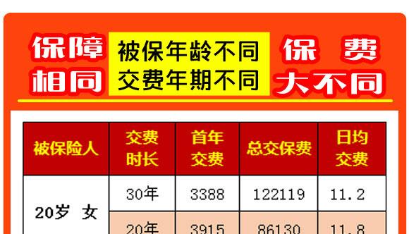 同样的保障(见上图),30岁女,首年交费4543元(比20岁女多交625元),交20年共119213元(比20岁女多交33083元),日均交费16.3元(比20岁女每天多交4.5元);