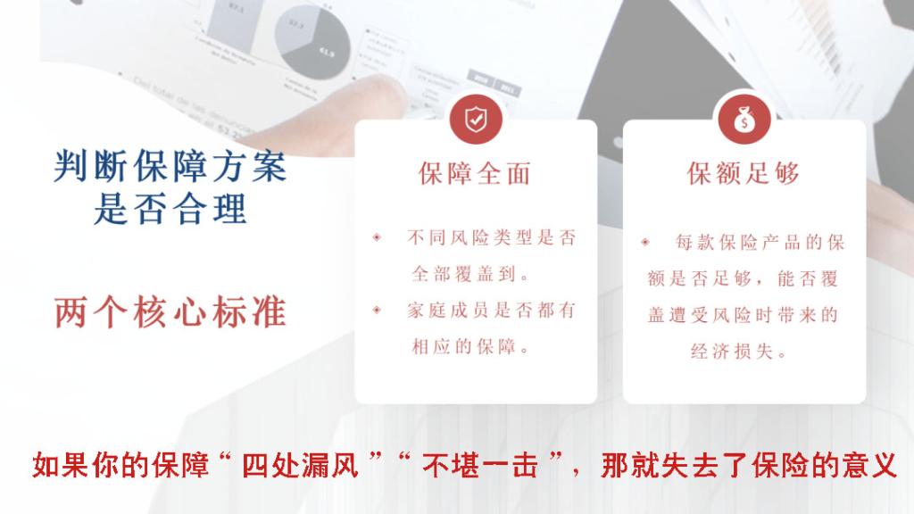 保障全面:不同的风险类型是否全面覆盖到;家庭成员是否都有相应的保障。