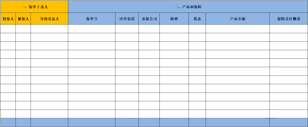 承保公司和险种,可快速了解在哪家公司买了什么产品,可快速查看同种险种是否重复购买(除了加保的情况),是否买全不同生命阶段需要的险种(如:重疾险,医疗险,意外险,寿险)。