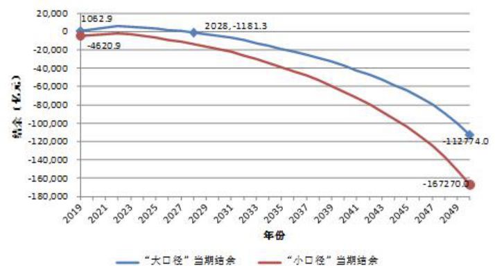 “养老金”剩下的钱会在勉强维持几年之后跳水式下降,并会在2028年开始出现赤字,并不断扩大。