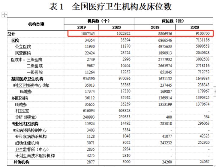到2020年,根据《2020年我国卫生健康事业发展统计公报》,全国医疗机构超过百万,床位数达到了910万张,如下表: