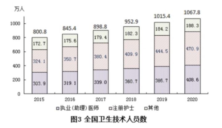 全国卫生技术人员也在逐年增加,2020年有1067万人从事医疗行业,职业医师是188.3万人,注册护士是470万人。