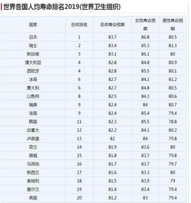 排名靠前的基本都是发达国家,总体平均寿命都超过了80岁,日本排名第一,紧跟的是瑞士、新加波、澳大利亚等国。