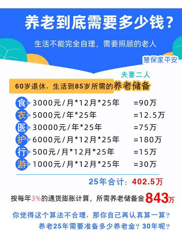 养老需要花多少钱?一般的养老生活也就过个日子,温饱就好;中等的养老生活还想要找个乐子,比如搞搞书法、绘画,每年出去旅行几次;高品质的养老生活,除了满足解决自己的物质生活之外,还要实现人生目标——为子孙后代留点款子,探寻生命意义——为社会做些有意义的善事。养老金的多少直接决定了我们过什么样的养老生活,它是因人而异的。一般说来,养老费用需要满足我们的物质需求、精神需求、医疗保障等需求。
