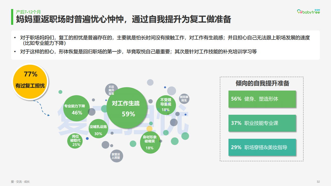 在高线城市,职场妈妈占比46.8%,从生完宝宝到重返职场,职场妈妈复工的担忧主要集中在怕长时间没有接触工作,对工作有生疏感;并且担心自己无法跟上职场发展的速度。